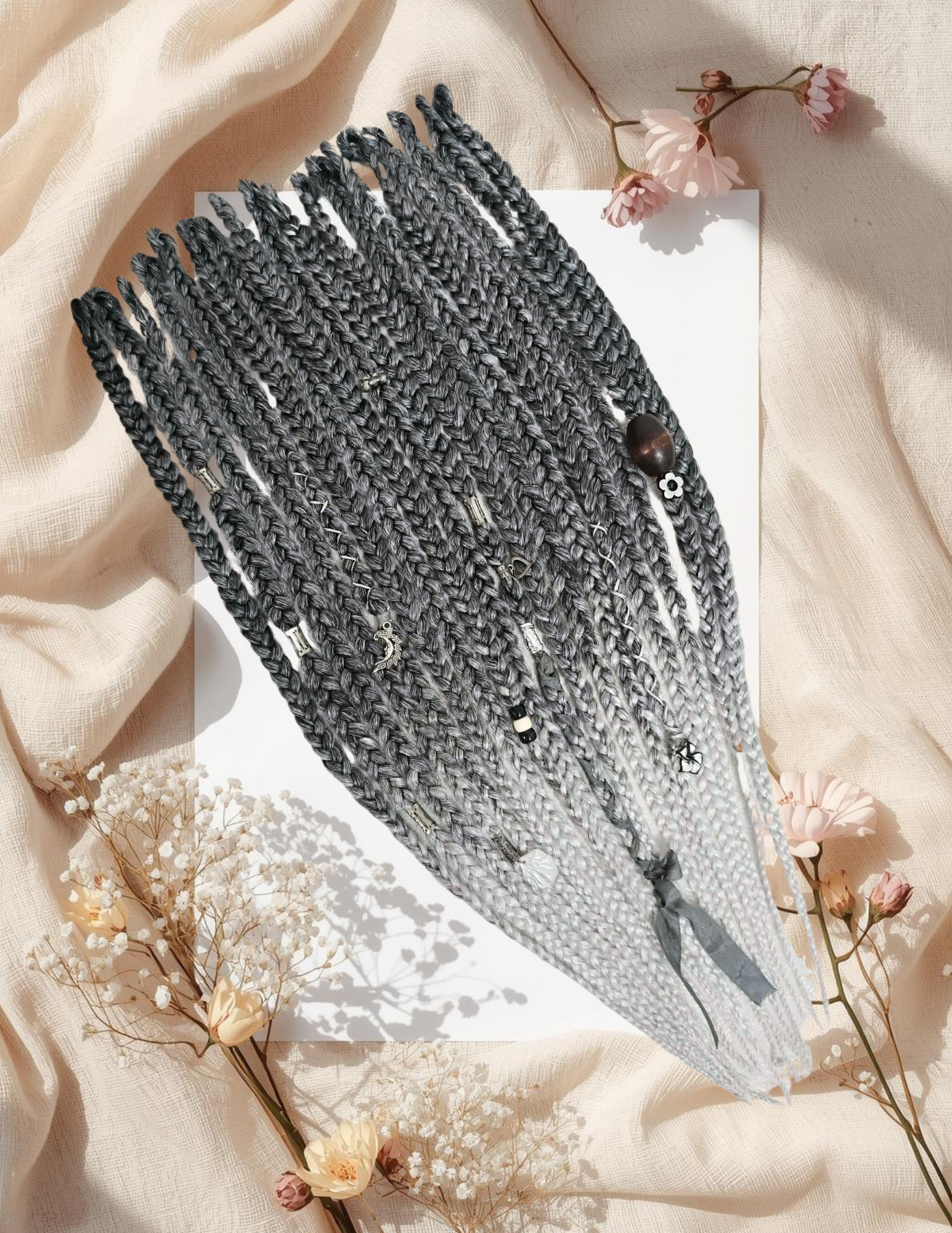 Extensions de tresses fines (tresses africaines) avec un dégradé ombré allant du gris foncé au blanc/gris clair, ornées de perles et de breloques.