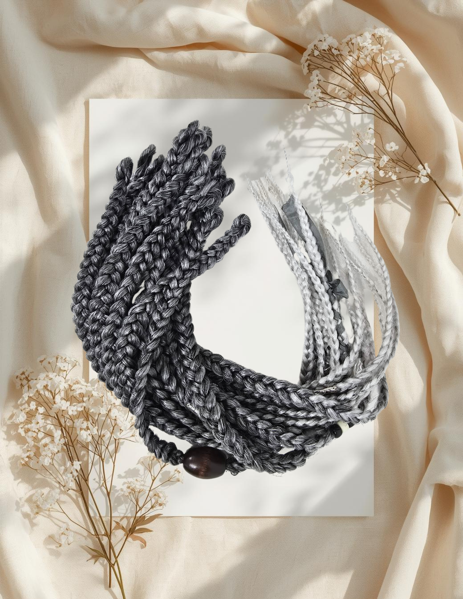 Matériaux : Fibres synthétiques (type Kanekalon), perles décoratives en métal, perles en bois et en acrylique, ruban en tissu.