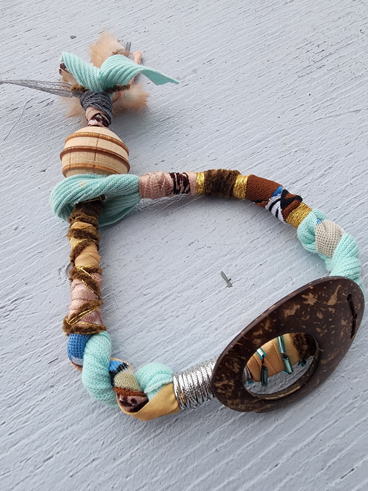 Matériaux Il est confectionné à partir de fil de coton ou de laine tressé, de morceaux de tissu, de perles en bois, d'un grand anneau en noix de coco, de petites perles en métal, de plumes et de cuir ou de suédine.