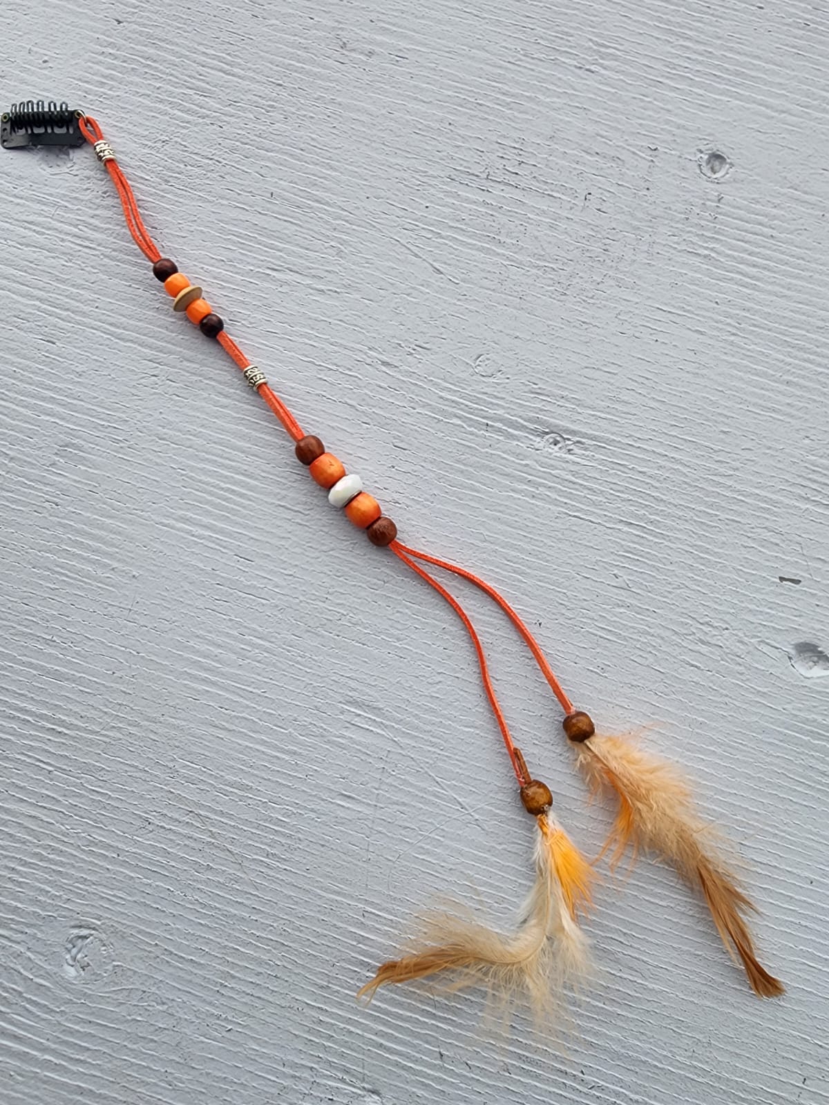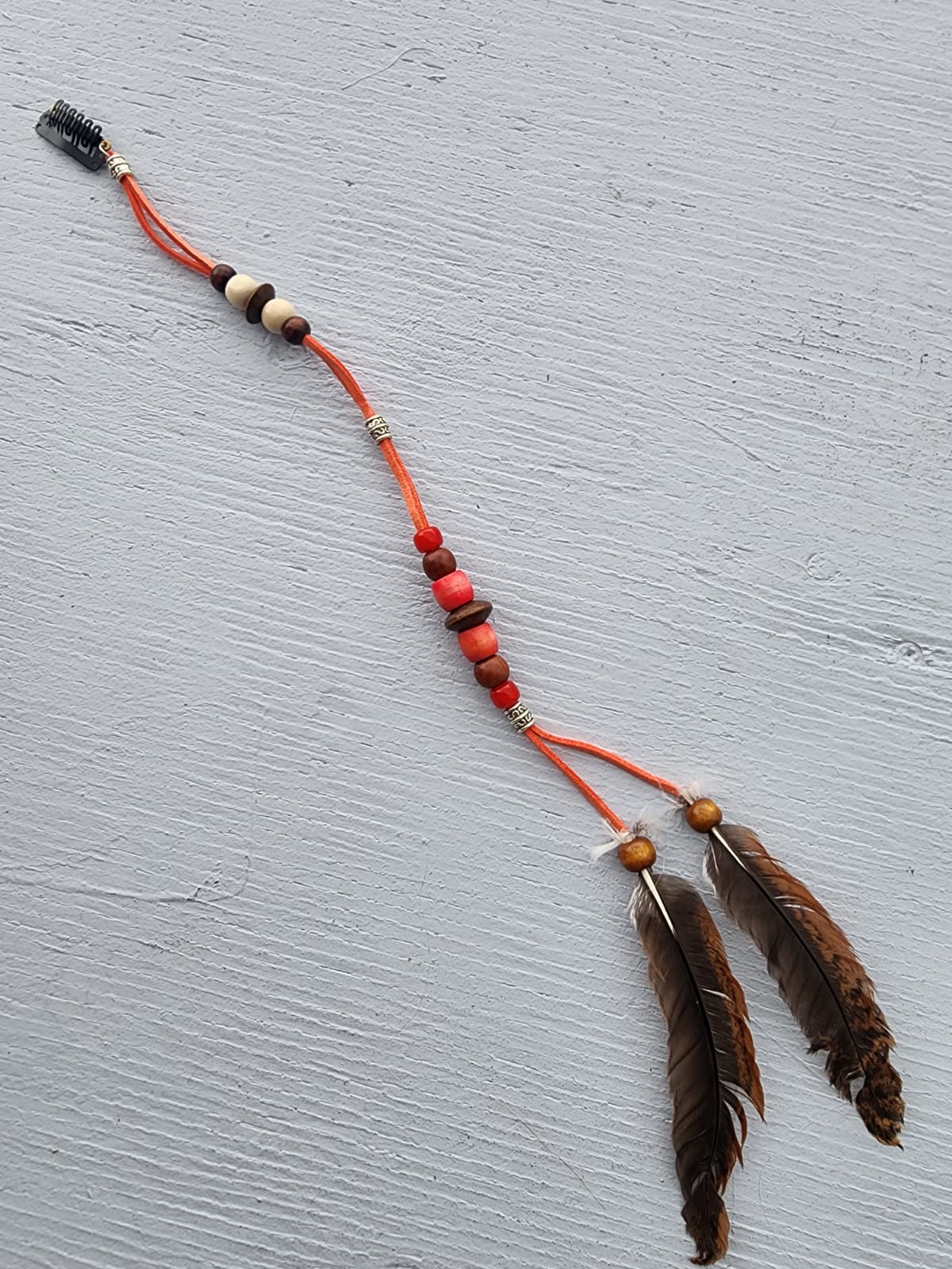 Couleurs La lanière est d'un orange ou rouge-orangé très vif. Les perles sont un mélange de bois clair, de bois foncé, et de rouge corail ou terracotta. Les plumes sont marron foncé avec des touches plus claires.