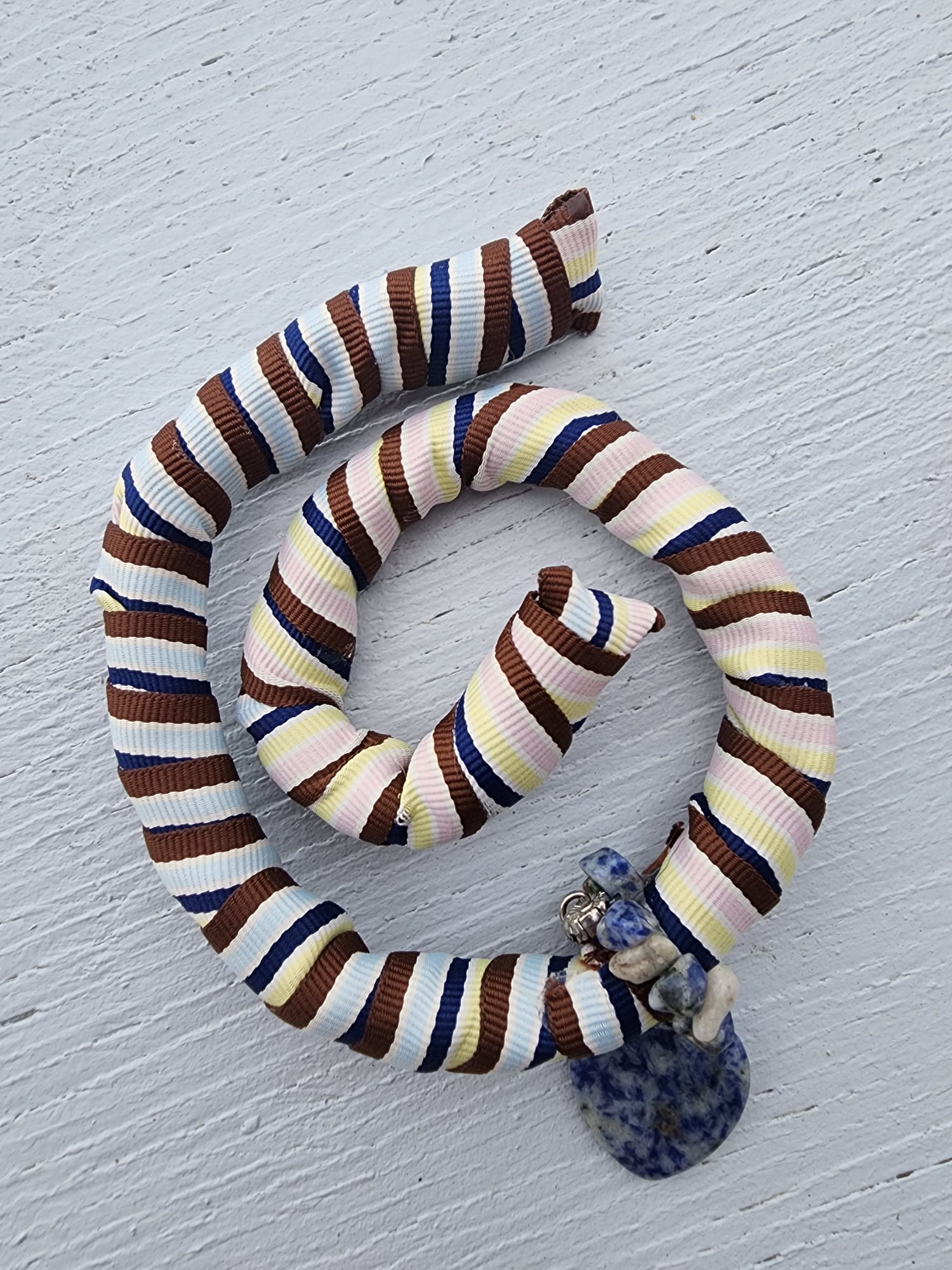 Matériaux : Ruban tissé ou gros-grain rayé. Breloque en pierre naturelle (probablement Lapis-lazuli ou Sodalite) de forme irrégulière/cœur. Élément de fixation métallique (anneau, fermoir).