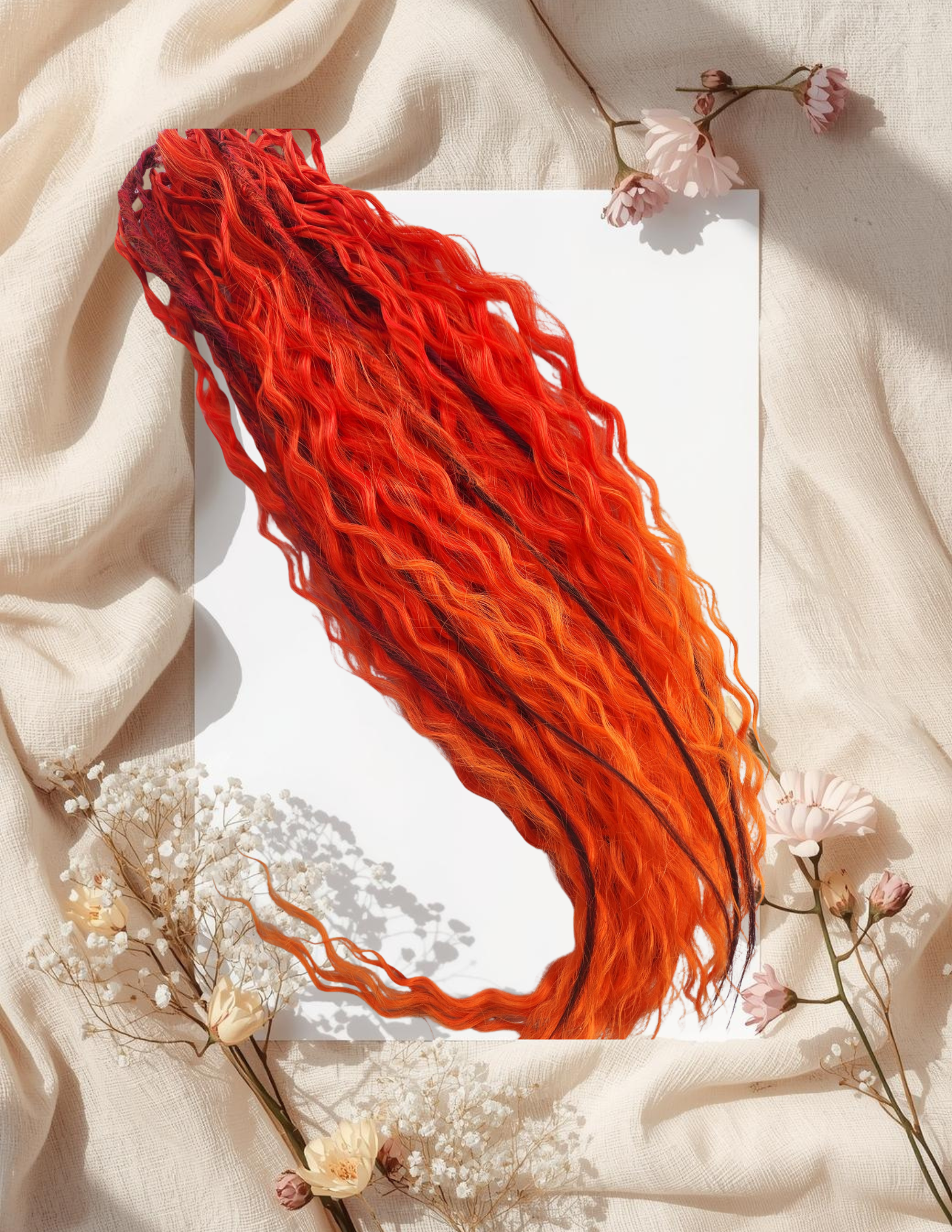 Curlocks brossables aux nuances ardentes mêlant orange vif et reflets cuivrés, inspirées de l’énergie d’une flamme solaire. Légères et douces au toucher, elles offrent un aspect bouclé et aérien tout en restant faciles à coiffer et à entretenir